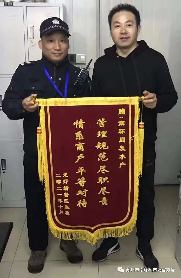 张喜在南环桥市场做螃蟹批发生意多年。前段时间有客户购买了他价值4万余元的商品,货款却一直未付,也不再来拿货了。张喜找到同发水产管理人员求助寻找欠款人。当班保安姚叶青了解后,第一时间把欠款人信息记录下来并向队长江其反应。江其立即带领整个管理班组现场查找,管伟伟迅速联系指调中心帮忙通过监控及车辆管理系统寻找车辆。经过同发水产和指调中心三天的不懈努力,终于找到欠款人并协助结清了欠款。张喜非常感激:“你们就像警察一样破案神速”。他拿出一叠现金表示感谢,被同发水产管理人员和指调中心婉言拒绝:“为商户服务是我们应该做的,这也是我们的荣幸”。后来张喜给同发水产和指调中心分别送去了锦旗。